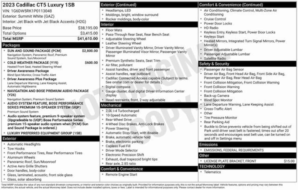 INCLUDES WARRANTY, Bose Performance Series Premium 15-Speaker System, Cold Weather Package, Heated Driver & Front Passenger Seats, Heated Steering Wheel, Navigation & Bose Premium Audio Package, Preferred Equipment Group 1SB, Radio: Cadillac User Experience w/Embedded Nav, SiriusXM w/360L, Sun & Sound Package, UltraView Dual Pane Sunroof, 3 USB Ports, 4-Wheel Disc Brakes, 9 Speakers, ABS brakes, Air Conditioning, Alloy wheels, AM/FM radio: SiriusXM with 360L, Apple CarPlay/Android Auto, Automatic Stop/Start w/Disable, Automatic temperature control, Brake assist, Bumpers: body-color, Compass, Delay-off headlights, Driver 2-Way Power Lumbar Seat Adjuster, Driver door bin, Driver vanity mirror, Dual front impact airbags, Dual front side impact airbags, Electronic Stability Control, Emergency communication system: OnStar and Cadillac connected services capable, Exterior Parking Camera Rear, Four wheel independent suspension, Front anti-roll bar, Front Bucket Seats, Front Center Armrest, Front dual zone A/C, Front License Plate Bracket, Front Passenger 2-Way Power Lumbar Seat Adjuster, Front reading lights, Fully automatic headlights, Garage door transmitter, HD Radio, Heated door mirrors, Illuminated entry, Inteluxe Seating Surfaces, Knee airbag, Leather steering wheel, Low tire pressure warning, Occupant sensing airbag, Outside temperature display, Overhead airbag, Overhead console, Panic alarm, Passenger door bin, Passenger vanity mirror, Power door mirrors, Power driver seat, Power passenger seat, Power steering, Power windows, Premium 9-Speaker Audio System Feature, Radio data system, Radio: Cadillac User Experience, Rain sensing wipers, Rear anti-roll bar, Rear reading lights, Rear seat center armrest, Rear window defroster, Remote keyless entry, Speed control, Speed-sensing steering, Split folding rear seat, Steering wheel mounted audio controls, Tachometer, Teen Driver, Telescoping steering wheel, Tilt steering wheel, Traction control, Trip computer, Turn signal indicator mirrors, Variably intermittent wipers, Voltmeter, Wheels: 18 Alloy w/Bright Silver Finish, Bose Performance Series Premium 15-Speaker System, Cold Weather Package, Heated Driver & Front Passenger Seats, Heated Steering Wheel, Navigation & Bose Premium Audio Package, Preferred Equipment Group 1SB, Radio: Cadillac User Experience w/Embedded Nav, SiriusXM w/360L, Sun & Sound Package, UltraView Dual Pane Sunroof.