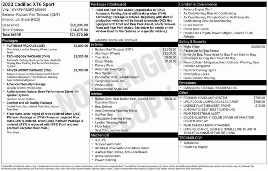 INCLUDES WARRANTY, 8 Color Driver Information Center Display, Adaptive Cruise Control, Automatic Emergency Braking, Automatic Parking Assist w/Braking, Automatic Seat Belt Tightening, Bose Performance Series Audio System, Driver Assist Package, Dual Driver Info Center Display Gauge Cluster, Enhanced Automatic Emergency Braking, Front & Rear Park Assist, Front & Rear Premium Carpeted Floor Mats, HD Surround Vision, Head-Up Display, Hitch Guidance, Hitch Guidance w/Hitch View, Inside Rear-View Auto-Dimming Mirror, Navigation System, Platinum Package, Radio: Cadillac User Experience w/Embedded Nav, Rear Camera Mirror, Rear Camera Mirror Washer, Rear Pedestrian Alert, Reverse Automatic Braking, Semi-Aniline Leather Seating Surfaces, SiriusXM w/360L, Smart Towing, Sport Package 1SF, Surround Vision Recorder, Technology Package, Teen Driver, 14 Speakers, 2-Way Power Driver Lumbar Control Seat Adjuster, 2-Way Power Passenger Lumbar Control Seat Adjuster, 3.49 Axle Ratio, 3rd row seats: split-bench, 4-Wheel Disc Brakes, 6-Passenger Seating, 8-Way Power Driver Seat Adjuster, ABS brakes, Adaptive suspension, Air Conditioning, Alloy wheels, AM/FM radio: SiriusXM with 360L, Audio memory, Auto High-beam Headlights, Auto tilt-away steering wheel, Auto-dimming door mirrors, Auto-dimming Rear-View mirror, Automatic Stop/Start w/Disable, Automatic temperature control, Body-Color Door Handles, Brake assist, Bumpers: body-color, Compass, Delay-off headlights, Driver & Front Passenger Heated Seats, Driver door bin, Driver vanity mirror, Dual front impact airbags, Dual front side impact airbags, Electronic Stability Control, Emergency communication system: OnStar and Cadillac connected services capable, Four wheel independent suspension, Front anti-roll bar, Front Bucket Seats, Front Center Armrest, Front dual zone A/C, Front License Plate Bracket, Front reading lights, Fully automatic headlights, Garage door transmitter, Heated door mirrors, Heated front seats, Heated rear seats, Heated steering wheel, Illuminated entry, Knee airbag, Leather Seating Surfaces w/Mini-Perforated Inserts, Low tire pressure warning, Memory seat, Night Vision, Occupant sensing airbag, Outside temperature display, Overhead airbag, Overhead console, Panic alarm, Passenger door bin, Passenger vanity mirror, Performance Suspension, Power door mirrors, Power driver seat, Power Liftgate, Power moonroof: UltraView, Power passenger seat, Power steering, Power windows, Premium Headlamp System, Puddle Lamps w/Cadillac Crest (LPO), Radio data system, Rain sensing wipers, Rear air conditioning, Rear anti-roll bar, Rear reading lights, Rear seat center armrest, Rear window defroster, Rear window wiper, Remote keyless entry, Roof rack: rails only, Security Cargo Shade, Security system, Speed control, Speed-sensing steering, Split folding rear seat, Spoiler, Steering wheel memory, Steering wheel mounted audio controls, Tachometer, Telescoping steering wheel, Tilt steering wheel, Traction control, Trip computer, Turn signal indicator mirrors, Variably intermittent wipers, Ventilated Driver & Front Passenger Seats, Ventilated front seats, Voltmeter, Wheels: 20 12-Spoke Diamond Cut Alloy, Wheels: 21 Multi-Spoke Alloy, 8 Color Driver Information Center Display, Adaptive Cruise Control, Automatic Emergency Braking, Automatic Parking Assist w/Braking, Automatic Seat Belt Tightening, Bose Performance Series Audio System, Driver Assist Package, Dual Driver Info Center Display Gauge Cluster, Enhanced Automatic Emergency Braking, Front & Rear Park Assist, Front & Rear Premium Carpeted Floor Mats, HD Surround Vision, Head-Up Display, Hitch Guidance, Hitch Guidance w/Hitch View, Inside Rear-View Auto-Dimming Mirror, Navigation System, Platinum Package, Radio: Cadillac User Experience w/Embedded Nav, Rear Camera Mirror, Rear Camera Mirror Washer, Rear Pedestrian Alert, Reverse Automatic Braking,