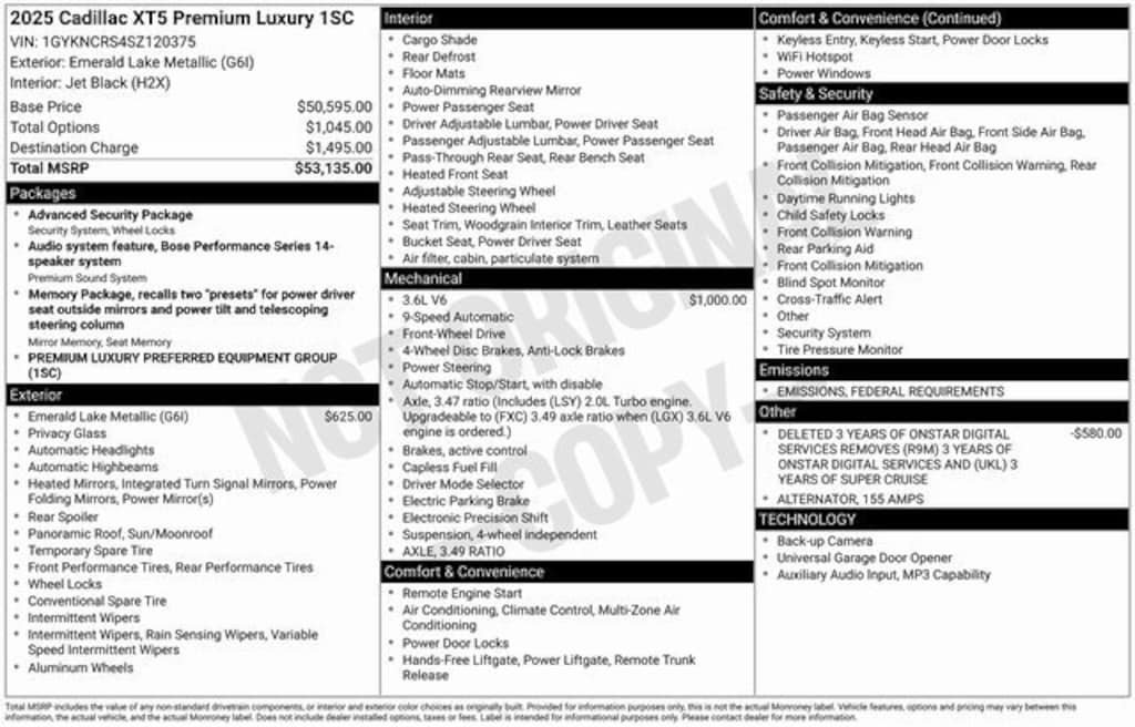 Emerald Lake Metallic 2025 Cadillac XT5 Premium LuxuryINCLUDES WARRANTY, Automatic Dual-Zone Climate Control, Automatic Emergency Braking, Bose Performance Series 14-Speaker System, Dual Driver Info Center Display Gauge Cluster, Front & Rear Park Assist, HD Rear Vision Camera, Inside Rear-View Auto-Dimming Mirror, Navigation System, Premium Luxury Package 1SC, Radio: Cadillac User Experience w/Embedded Nav, SiriusXM w/360L Trial Subscription, Teen Driver, Wireless Apple CarPlay/Wireless Android Auto, Wireless Phone Charging, 14 Speakers, 155 Amp Alternator, 2-Way Power Driver Lumbar Control Seat Adjuster, 2-Way Power Passenger Lumbar Control Seat Adjuster, 4-Wheel Disc Brakes, 4-Wheel Independent Suspension, ABS brakes, Air Conditioning, Alloy wheels, AM/FM radio: SiriusXM, Audio memory, Auto High-beam Headlights, Auto-dimming door mirrors, Auto-dimming Rear-View mirror, Automatic Stop/Start w/Disable, Automatic temperature control, Bodyside moldings, Brake assist, Bumpers: body-color, Compass, Delay-off headlights, Deleted 3 Years of OnStar Digital Services, Driver door bin, Driver vanity mirror, Dual front impact airbags, Dual front side impact airbags, Electronic Stability Control, Emergency communication system: OnStar and Cadillac connected services capable, Four wheel independent suspension, Front anti-roll bar, Front Bucket Seats, Front Center Armrest, Front dual zone A/C, Front reading lights, Fully automatic headlights, Garage door transmitter, Genuine wood dashboard insert, Genuine wood door panel insert, Heated door mirrors, Heated Driver & Front Passenger Seats, Heated front seats, Heated steering wheel, Illuminated entry, Knee airbag, Leather Seating Surfaces w/Mini Perforated Inserts, Low tire pressure warning, Memory seat, Occupant sensing airbag, Outside temperature display, Overhead airbag, Overhead console, Panic alarm, Passenger door bin, Passenger vanity mirror, Power door mirrors, Power driver seat, Power Liftgate, Power moonroof: UltraView, Power passenger seat, Power steering, Power windows, Radio data system, Rain sensing wipers, Rear anti-roll bar, Rear reading lights, Rear seat center armrest, Rear window defroster, Rear window wiper, Remote keyless entry, Security system, Speed control, Speed-sensing steering, Split folding rear seat, Spoiler, Steering wheel memory, Steering wheel mounted audio controls, Tachometer, Telescoping steering wheel, Tilt steering wheel, Traction control, Trip computer, Turn signal indicator mirrors, Variably intermittent wipers, Voltmeter, Wheels: 20 6-Split Spoke Alloy, Automatic Dual-Zone Climate Control, Automatic Emergency Braking, Bose Performance Series 14-Speaker System, Dual Driver Info Center Display Gauge Cluster, Front & Rear Park Assist, HD Rear Vision Camera, Inside Rear-View Auto-Dimming Mirror, Navigation System, Premium Luxury Package 1SC, Radio: Cadillac User Experience w/Embedded Nav, SiriusXM w/360L Trial Subscription, Teen Driver, Wireless Apple CarPlay/Wireless Android Auto, Wireless Phone Charging.CARFAX One-Owner. Clean CARFAX.Why Choose Cadillac of Fayetteville for Your Next New or Pre-Owned Cadillac Purchase:Unparalleled Cadillac Luxury: Whether new or pre-owned, our Cadillac vehicles offer unmatched luxury and sophistication, elevating your driving experience.Tailored Customer Experience: At Cadillac of Fayetteville, we prioritize your satisfaction, providing a personalized and seamless car-buying journey for both new and pre-owned vehicles.Certified Quality: Each vehicle in our inventory, whether new or pre-owned, undergoes rigorous inspection, ensuring exceptional quality and reliability on the road.Extended Peace of Mind: Drive with confidence knowing that every purchase, whether new or pre-owned, includes a minimum 3 months/3000 miles warranty.Exclusive Cadillac Benefits: Enjoy exclusive perks and features designed to enhance your ownership experience, available with both new and pre-owned Cadillac vehicles.Service Appreci