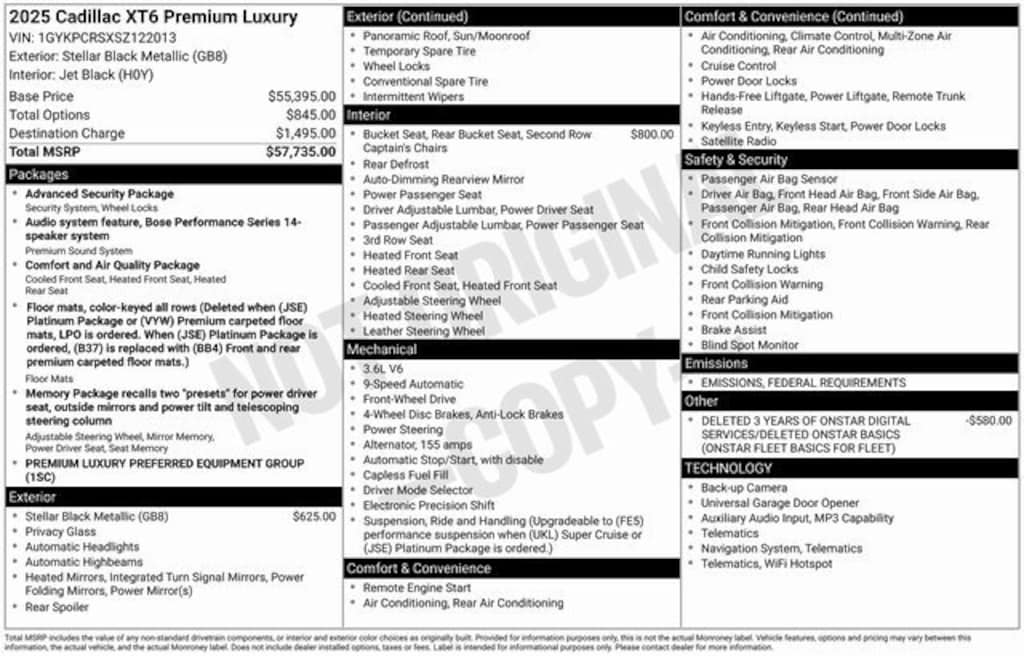 INCLUDES WARRANTY, Automatic Emergency Braking, Bose Performance Series Audio System, Dual Driver Info Center Display Gauge Cluster, Front & Rear Park Assist, Inside Rear-View Auto-Dimming Mirror, Navigation System, Preferred Equipment Group 1SC, Radio: Cadillac User Experience w/Embedded Nav, SiriusXM w/360L, Teen Driver, Wireless Apple CarPlay/Wireless Android Auto, 14 Speakers, 2-Way Power Driver Lumbar Control Seat Adjuster, 2-Way Power Passenger Lumbar Control Seat Adjuster, 3rd row seats: split-bench, 4-Wheel Disc Brakes, 6-Passenger Seating, 8-Way Power Driver Seat Adjuster, ABS brakes, Air Conditioning, Alloy wheels, AM/FM radio: SiriusXM with 360L, Audio memory, Auto High-beam Headlights, Auto tilt-away steering wheel, Auto-dimming door mirrors, Auto-dimming Rear-View mirror, Automatic Stop/Start w/Disable, Automatic temperature control, Brake assist, Bumpers: body-color, Compass, Delay-off headlights, Deleted 3 Years of OnStar Digital Services, Driver & Front Passenger Heated Seats, Driver door bin, Driver vanity mirror, Dual front impact airbags, Dual front side impact airbags, Electronic Stability Control, Emergency communication system: OnStar and Cadillac connected services capable, Four wheel independent suspension, Front anti-roll bar, Front Bucket Seats, Front Center Armrest, Front dual zone A/C, Front reading lights, Fully automatic headlights, Garage door transmitter, Genuine wood dashboard insert, Genuine wood door panel insert, Heated door mirrors, Heated front seats, Heated rear seats, Heated steering wheel, Illuminated entry, Knee airbag, Leather Seating Surfaces w/Mini-Perforated Inserts, Leather steering wheel, Low tire pressure warning, Memory seat, Occupant sensing airbag, Outside temperature display, Overhead airbag, Overhead console, Panic alarm, Passenger door bin, Passenger vanity mirror, Power door mirrors, Power driver seat, Power Liftgate, Power moonroof: UltraView, Power passenger seat, Power steering, Power windows, Radio data system, Rain sensing wipers, Rear air conditioning, Rear anti-roll bar, Rear reading lights, Rear seat center armrest, Rear window defroster, Rear window wiper, Remote keyless entry, Ride & Handling Suspension, Security system, Speed control, Speed-sensing steering, Split folding rear seat, Spoiler, Steering wheel memory, Steering wheel mounted audio controls, Tachometer, Telescoping steering wheel, Tilt steering wheel, Traction control, Trip computer, Turn signal indicator mirrors, Variably intermittent wipers, Ventilated Driver & Front Passenger Seats, Ventilated front seats, Voltmeter, Wheels: 20 6-Split Spoke Alloy, Automatic Emergency Braking, Bose Performance Series Audio System, Dual Driver Info Center Display Gauge Cluster, Front & Rear Park Assist, Inside Rear-View Auto-Dimming Mirror, Navigation System, Preferred Equipment Group 1SC, Radio: Cadillac User Experience w/Embedded Nav, SiriusXM w/360L, Teen Driver, Wireless Apple CarPlay/Wireless Android Auto.