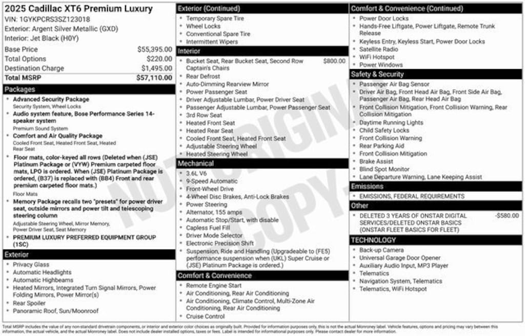 INCLUDES WARRANTY, Automatic Emergency Braking, Bose Performance Series Audio System, Dual Driver Info Center Display Gauge Cluster, Front & Rear Park Assist, Inside Rear-View Auto-Dimming Mirror, Preferred Equipment Group 1SC, Radio: Cadillac User Experience w/Embedded Nav, SiriusXM w/360L, Teen Driver, Wireless Apple CarPlay/Wireless Android Auto, 14 Speakers, 2-Way Power Driver Lumbar Control Seat Adjuster, 2-Way Power Passenger Lumbar Control Seat Adjuster, 3rd row seats: split-bench, 4-Wheel Disc Brakes, 6-Passenger Seating, 8-Way Power Driver Seat Adjuster, ABS brakes, Air Conditioning, Alloy wheels, AM/FM radio: SiriusXM with 360L, Audio memory, Auto High-beam Headlights, Auto tilt-away steering wheel, Auto-dimming door mirrors, Auto-dimming Rear-View mirror, Automatic Stop/Start w/Disable, Automatic temperature control, Brake assist, Bumpers: body-color, Compass, Delay-off headlights, Deleted 3 Years of OnStar Digital Services, Driver & Front Passenger Heated Seats, Driver door bin, Driver vanity mirror, Dual front impact airbags, Dual front side impact airbags, Electronic Stability Control, Emergency communication system: OnStar and Cadillac connected services capable, Four wheel independent suspension, Front anti-roll bar, Front Bucket Seats, Front Center Armrest, Front dual zone A/C, Front reading lights, Fully automatic headlights, Garage door transmitter, Genuine wood dashboard insert, Genuine wood door panel insert, Heated door mirrors, Heated front seats, Heated rear seats, Heated steering wheel, Illuminated entry, Knee airbag, Leather Seating Surfaces w/Mini-Perforated Inserts, Leather steering wheel, Low tire pressure warning, Memory seat, Navigation System, Occupant sensing airbag, Outside temperature display, Overhead airbag, Overhead console, Panic alarm, Passenger door bin, Passenger vanity mirror, Power door mirrors, Power driver seat, Power Liftgate, Power moonroof: UltraView, Power passenger seat, Power steering, Power windows, Radio data system, Rain sensing wipers, Rear air conditioning, Rear anti-roll bar, Rear reading lights, Rear seat center armrest, Rear window defroster, Rear window wiper, Remote keyless entry, Ride & Handling Suspension, Security system, Speed control, Speed-sensing steering, Split folding rear seat, Spoiler, Steering wheel memory, Steering wheel mounted audio controls, Tachometer, Telescoping steering wheel, Tilt steering wheel, Traction control, Trip computer, Turn signal indicator mirrors, Variably intermittent wipers, Ventilated Driver & Front Passenger Seats, Ventilated front seats, Voltmeter, Wheels: 20 6-Split Spoke Alloy, Automatic Emergency Braking, Bose Performance Series Audio System, Dual Driver Info Center Display Gauge Cluster, Front & Rear Park Assist, Inside Rear-View Auto-Dimming Mirror, Preferred Equipment Group 1SC, Radio: Cadillac User Experience w/Embedded Nav, SiriusXM w/360L, Teen Driver, Wireless Apple CarPlay/Wireless Android Auto.