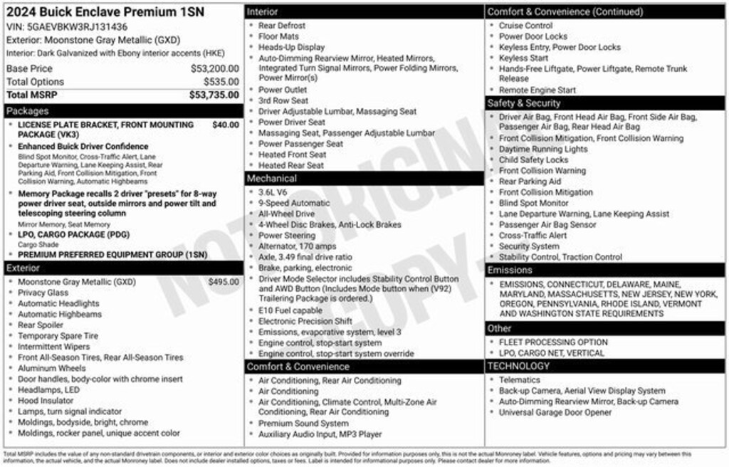 INCLUDES WARRANTY, AWD, Cargo Package (LPO), Cargo Security Shade (LPO), Front Mounting License Plate Bracket Package, Navigation System, Preferred Equipment Group 1SN, Vehicle Health Management, Vertical Cargo Net (LPO), 10 Speakers, 18 Aluminum Wheels, 3.49 Final Drive Axle Ratio, 3rd row seats: split-bench, 4-Wheel Disc Brakes, 6-Way Power Front Passenger Seat Adjuster, 7-Passenger Seating, 8-Way Power Driver Seat Adjuster, ABS brakes, Air Conditioning, Alloy wheels, AM/FM radio: SiriusXM with 360L, Auto High-beam Headlights, Auto-dimming door mirrors, Auto-dimming Rear-View mirror, Automatic temperature control, Bose Performance-Enhanced 10-Speaker System, Brake assist, Bumpers: body-color, Compass, Delay-off headlights, Driver 4-Way Power Lumbar Seat Adjuster, Driver door bin, Driver vanity mirror, Dual front impact airbags, Dual front side impact airbags, Electronic Stability Control, Emergency communication system: OnStar and Buick connected services capable, Exterior Parking Camera Rear, Four wheel independent suspension, Front anti-roll bar, Front Bucket Seats, Front Center Armrest, Front dual zone A/C, Front Passenger 4-Way Power Lumbar Seat Adjuster, Front reading lights, Fully automatic headlights, Garage door transmitter, Heads-Up Display, Heated door mirrors, Heated Driver & Front Passenger Seats, Heated front seats, Heated rear seats, Heated steering wheel, Illuminated entry, Leather steering wheel, Low tire pressure warning, Memory seat, Occupant sensing airbag, Outside temperature display, Overhead airbag, Overhead console, Panic alarm, Passenger door bin, Passenger vanity mirror, Perforated Leather-Appointed Seat Trim, Power door mirrors, Power driver seat, Power Liftgate, Power passenger seat, Power steering, Power windows, Premium audio system: Buick Infotainment System, Radio data system, Radio: Buick Infotainment Sys AM/FM Stereo w/Nav, Rear air conditioning, Rear anti-roll bar, Rear reading lights, Rear window defroster, Rear window wiper, Remote keyless entry, Security system, SiriusXM w/360L, Speed control, Speed-sensing steering, Spoiler, Steering wheel memory, Steering wheel mounted audio controls, Tachometer, Telescoping steering wheel, Tilt steering wheel, Traction control, Trip computer, Turn signal indicator mirrors, Variably intermittent wipers, Ventilated Driver & Front Passenger Seats, Ventilated front seats, Voltmeter, Wireless Apple CarPlay/Wireless Android Auto, AWD, Cargo Package (LPO), Cargo Security Shade (LPO), Front Mounting License Plate Bracket Package, Navigation System, Preferred Equipment Group 1SN, Vehicle Health Management, Vertical Cargo Net (LPO).
