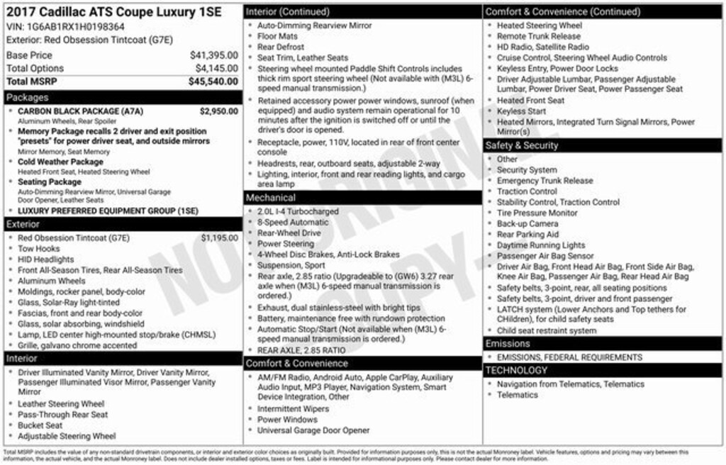 INCLUDES WARRANTY, 2.85 Rear Axle Ratio, 4-Wheel Disc Antilock Brembo Fr Performance Brakes, Black Chrome Grille, Bluetooth For Phone/Audio, Body-Colored Door Handles, Bose Premium Surround Sound 12-Speaker System, Cadillac CUE & Navigation, Carbon Black Package, Cold Weather Package, Dark Finish Exterior Content, Electronic Sound Enhancer Noise Control, Heated Driver & Front Passenger Seats, Heated Steering Wheel Rim, Leather w/Sueded Microfiber Inserts & Seatbacks, Luxury Equipment Group 1SE, Navigation System, Rear Spoiler, Recaro Performance Seats, SiriusXM & HD Audio System, Wheels: 18 After Midnight Dark Finish Alloy, Wireless Charging, 110V Power Receptacle, 12 Speakers, 18 x 8 Painted Alloy Wheels, 4-Wheel Disc Brakes, ABS brakes, Air Conditioning, Alloy wheels, AM/FM radio: SiriusXM, Apple CarPlay/Android Auto, Auto-dimming door mirrors, Auto-dimming Rear-View mirror, Automatic temperature control, Brake assist, Bumpers: body-color, Compass, Delay-off headlights, Driver door bin, Driver vanity mirror, Dual front impact airbags, Dual front side impact airbags, Electronic Stability Control, Emergency communication system, Exterior Parking Camera Rear, Four wheel independent suspension, Front anti-roll bar, Front Bucket Seats, Front Center Armrest, Front dual zone A/C, Front reading lights, Fully automatic headlights, Garage door transmitter, Heated door mirrors, Heated front seats, Heated steering wheel, High-Intensity Discharge Headlights, Illuminated entry, Knee airbag, Leather Seating Surfaces, Leather Shift Knob, Low tire pressure warning, Memory seat, Occupant sensing airbag, Outside temperature display, Overhead airbag, Overhead console, Panic alarm, Passenger door bin, Passenger vanity mirror, Performance Seats, Power door mirrors, Power driver seat, Power passenger seat, Power steering, Power windows, Radio data system, Radio: Cadillac CUE Info/Media Ctrl w/Embedded Nav, Rear anti-roll bar, Rear reading lights, Rear Vision Camera, Rear window defroster, Remote keyless entry, Speed control, Speed-sensing steering, Split folding rear seat, Sport steering wheel, Steering wheel mounted audio controls, Tachometer, Telescoping steering wheel, Tilt steering wheel, Traction control, Trip computer, Turn signal indicator mirrors, Variably intermittent wipers, Voltmeter, 2.85 Rear Axle Ratio, 4-Wheel Disc Antilock Brembo Fr Performance Brakes, Black Chrome Grille, Bluetooth For Phone/Audio, Body-Colored Door Handles, Bose Premium Surround Sound 12-Speaker System, Cadillac CUE & Navigation, Carbon Black Package, Cold Weather Package, Dark Finish Exterior Content, Electronic Sound Enhancer Noise Control, Heated Driver & Front Passenger Seats, Heated Steering Wheel Rim, Leather w/Sueded Microfiber Inserts & Seatbacks, Luxury Equipment Group 1SE, Navigation System, Rear Spoiler, Recaro Performance Seats, SiriusXM & HD Audio System, Wheels: 18 After Midnight Dark Finish Alloy, Wireless Charging.