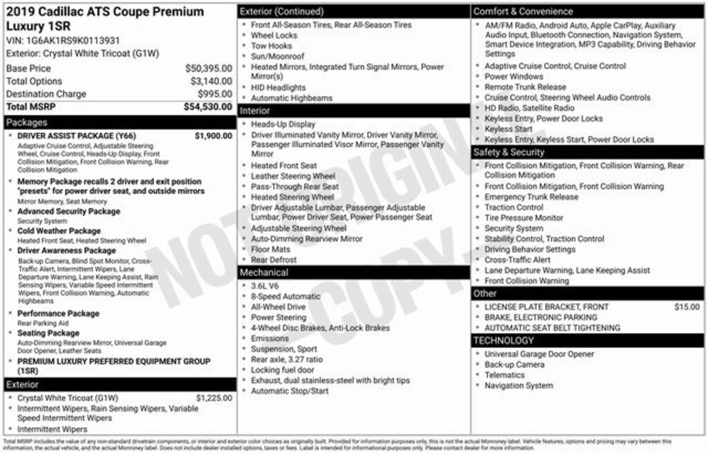 Crystal White Tricoat 2019 Cadillac ATS 3.6L Premium LuxuryINCLUDES WARRANTY, 3.27 Rear Axle Ratio, 4-Wheel Disc Antilock Brembo Fr Performance Brakes, Adaptive Remote Start, Advanced Adaptive Cruise Control, Advanced Security Package, Automatic Heated Steering Wheel, Automatic Seat Belt Tightening, Bluetooth For Phone/Audio, Cold Weather Package, Driver Assist Package, Driver Awareness Package, Electronic Parking Brake, Following Distance Indicator, Forward & Reverse Automatic Braking, Forward Automatic Braking, Forward Collision Alert, Head-Up Display, Heated Driver & Front Passenger Seats, Illuminating Door Handles, Inclination Sensor, IntelliBeam Automatic High Beam On/Off, Lane Change Alert w/Side Blind Zone Alert, Lane Keep Assist w/Lane Departure Warning, Locking Fuel Door, Locking Wheel Lugs, Navigation System, Power Sunroof, Power Tilt & Telescoping Steering Column, Premium Luxury Equipment Group 1SR, Rainsense Wipers, Rear Cross Traffic Alert, Rear Vision Camera, Self-Powered Shielded Theft-Deterrent Alarm System, Steering Column Lock Control, Wireless Charging, 110V Power Receptacle, 12 Speakers, 18 x 8 Polished Alloy Wheels, 4-Wheel Disc Brakes, ABS brakes, Air Conditioning, Alloy wheels, AM/FM radio: SiriusXM, Apple CarPlay/Android Auto, Auto High-beam Headlights, Auto-dimming door mirrors, Auto-dimming Rear-View mirror, Automatic Stop/Start, Automatic temperature control, Bose Premium Surround Sound 12-Speaker System, Brake assist, Bumpers: body-color, Compass, Delay-off headlights, Driver door bin, Driver vanity mirror, Dual front impact airbags, Dual front side impact airbags, Electronic Stability Control, Emergency communication system: OnStar and Cadillac connected services capable, Exterior Parking Camera Rear, Four wheel independent suspension, Front anti-roll bar, Front Bucket Seats, Front Center Armrest, Front dual zone A/C, Front License Plate Bracket, Front reading lights, Fully automatic headlights, Garage door transmitter, Heated door mirrors, Heated front seats, Heated steering wheel, High-Intensity Discharge Headlights, Illuminated entry, Knee airbag, Leather Seating Surfaces, Leather Shift Knob, Low tire pressure warning, Memory seat, Occupant sensing airbag, Outside temperature display, Overhead airbag, Overhead console, Panic alarm, Passenger door bin, Passenger vanity mirror, Power door mirrors, Power driver seat, Power moonroof, Power passenger seat, Power steering, Power windows, Radio data system, Radio: Cadillac User Experience AM/FM Stereo w/Nav, Rain sensing wipers, Rear anti-roll bar, Rear reading lights, Rear window defroster, Remote keyless entry, Seat Adjusters, Security system, SiriusXM & HD Radio, Speed control, Speed-sensing steering, Split folding rear seat, Sport steering wheel, Steering wheel mounted audio controls, Tachometer, Telescoping steering wheel, Tilt steering wheel, Traction control, Trip computer, Turn signal indicator mirrors, Variably intermittent wipers, Voltmeter, 3.27 Rear Axle Ratio, 4-Wheel Disc Antilock Brembo Fr Performance Brakes, Adaptive Remote Start, Advanced Adaptive Cruise Control, Advanced Security Package, Automatic Heated Steering Wheel, Automatic Seat Belt Tightening, Bluetooth For Phone/Audio, Cold Weather Package, Driver Assist Package, Driver Awareness Package, Electronic Parking Brake, Following Distance Indicator, Forward & Reverse Automatic Braking, Forward Automatic Braking, Forward Collision Alert, Head-Up Display, Heated Driver & Front Passenger Seats, Illuminating Door Handles, Inclination Sensor, IntelliBeam Automatic High Beam On/Off, Lane Change Alert w/Side Blind Zone Alert, Lane Keep Assist w/Lane Departure Warning, Locking Fuel Door, Locking Wheel Lugs, Navigation System, Power Sunroof, Power Tilt & Telescoping Steering Column, Premium Luxury Equipment Group 1SR, Rainsense Wipers, Rear Cross Traffic Alert, Rear Vision Camera, Self-Powered Shielded Theft-Deterrent Alarm System, Steering Column Lock Control, Wireless Charging.