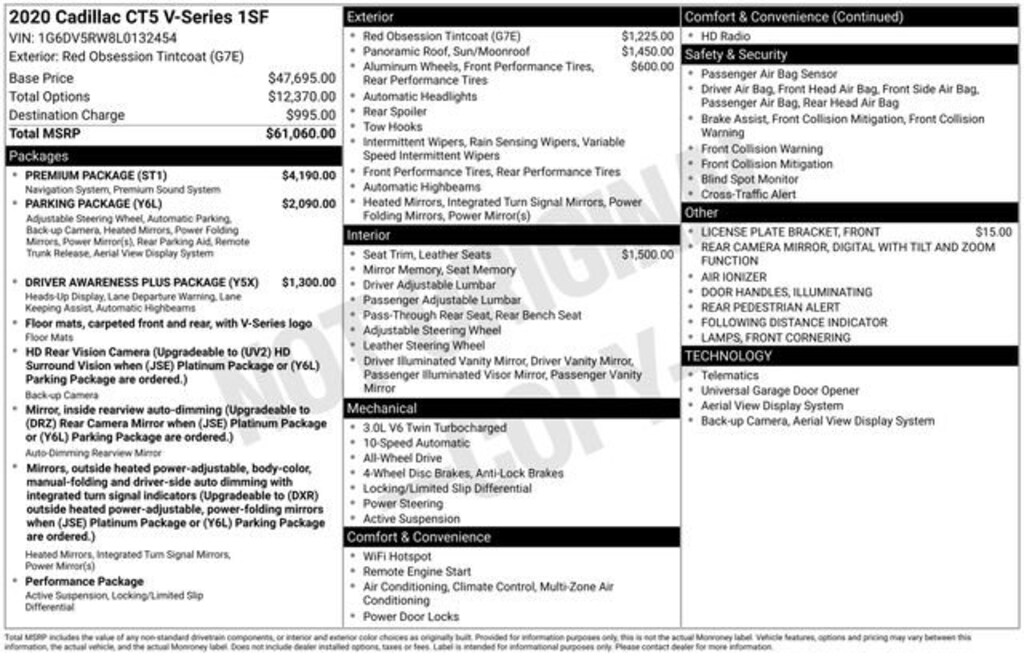 Discover the exhilarating performance and refined luxury of the 2020 Cadillac CT5 V-Series. This captivating sports sedan offers a thrilling driving experience combined with the exceptional craftsmanship and advanced technology you expect from Cadillac.Meticulously equipped with an impressive array of premium features, this CT5 V-Series is ready to elevate your driving experience. Key highlights include:- SUNROOF, ULTRAVIEW, DUAL PANE, SPANS BOTH ROWS OF SEATING- Bose Performance Series Premium 15-Speaker System- SiriusXM Radio- Air Ionizer- Head-Up Display- Automatic Heated Steering Wheel- Power Tilt & Telescoping Steering Column- Automatic Parking Assist with Braking- Rear Camera Mirror- Surround Vision Recorder- Ventilated Driver & Front Passenger SeatsPowered by a potent 3.0L V6 engine paired with a responsive 10-speed automatic transmission and all-wheel drive, the CT5 V-Series delivers exhilarating performance that will leave you captivated. With 17 city / 25 highway MPG, you can enjoy the thrill of the drive while maintaining impressive efficiency.The stunning Red Obsession Tintcoat exterior complements the luxurious Jet Black leather-appointed interior, creating a striking and sophisticated appearance. Meticulously crafted details, such as the 19-inch Diamond Cut alloy wheels and carbon fiber accents, elevate the CT5 V-Series to a new level of refinement.Cutting-edge technology is seamlessly integrated throughout the cabin, including the Cadillac User Experience with embedded navigation, a reconfigurable driver information display, and a host of advanced driver assistance features. From the Head-Up Display to the Surround Vision Recorder, this CT5 V-Series is equipped to keep you informed, connected, and safe on the road.Whether you're seeking exhilarating performance, sophisticated style, or the latest in automotive technology, the 2020 Cadillac CT5 V-Series delivers an unparalleled driving experience. We invite you to experience the power and prestige of this exceptional sports sedan for yourself. Contact us today to schedule a test drive and discover the true essence of Cadillac craftsmanship.