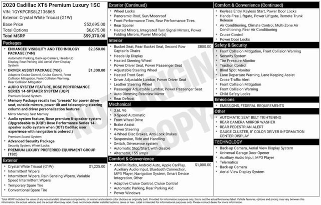 INCLUDES WARRANTY, 8 Color Driver Information Center Display, Advanced Adaptive Cruise Control, Automatic Emergency Braking, Automatic Parking Assist w/Braking, Automatic Seat Belt Tightening, Bose Performance Series Audio System, Bose Premium 8-Speaker Audio System, Driver Assist Package, Enhanced Automatic Emergency Braking, Enhanced Visibility & Technology Package, Front & Rear Park Assist, HD Surround Vision, Head-Up Display, Premium Luxury Package 1SC, Radio: Cadillac User Experience w/Embedded Nav, Rear Camera Mirror, Rear Camera Mirror Washer, Rear Pedestrian Alert, Reverse Automatic Braking, SiriusXM w/360L, Surround Vision Recorder, Teen Driver, 2-Way Power Driver Lumbar Control Seat Adjuster, 2-Way Power Passenger Lumbar Control Seat Adjuster, 3.49 Axle Ratio, 3rd row seats: split-bench, 4-Wheel Disc Brakes, 6-Passenger Seating, 8 Speakers, ABS brakes, Air Conditioning, Alloy wheels, AM/FM radio: SiriusXM, AppLink/Apple CarPlay and Android Auto, Audio memory, Auto High-beam Headlights, Auto tilt-away steering wheel, Auto-dimming door mirrors, Auto-dimming Rear-View mirror, Automatic Stop/Start w/Disable, Automatic temperature control, Brake assist, Bumpers: body-color, Compass, Delay-off headlights, Driver & Front Passenger Heated Seats, Driver door bin, Driver vanity mirror, Dual front impact airbags, Dual front side impact airbags, Electronic Stability Control, Emergency communication system: OnStar and Cadillac connected services capable, Exterior Parking Camera Rear, Four wheel independent suspension, Front anti-roll bar, Front Bucket Seats, Front Center Armrest, Front dual zone A/C, Front reading lights, Fully automatic headlights, Garage door transmitter, Heated door mirrors, Heated front seats, Heated steering wheel, Illuminated entry, Knee airbag, Leather Seating Surfaces w/Mini-Perforated Inserts, Leather steering wheel, Low tire pressure warning, Memory seat, Occupant sensing airbag, Outside temperature display, Overhead airbag, Overhead console, Panic alarm, Passenger door bin, Passenger vanity mirror, Power door mirrors, Power driver seat, Power Liftgate, Power moonroof: UltraView, Power passenger seat, Power steering, Power windows, Radio data system, Radio: Cadillac User Experience AM/FM Stereo, Rain sensing wipers, Rear air conditioning, Rear anti-roll bar, Rear reading lights, Rear seat center armrest, Rear window defroster, Rear window wiper, Remote keyless entry, Ride & Handling Suspension, Roof rack: rails only, Security system, Speed control, Speed-sensing steering, Split folding rear seat, Spoiler, Steering wheel memory, Steering wheel mounted audio controls, Tachometer, Telescoping steering wheel, Tilt steering wheel, Traction control, Trip computer, Turn signal indicator mirrors, Variably intermittent wipers, Voltmeter, Wheels: 20 6-Split Spoke Alloy, 8 Color Driver Information Center Display, Advanced Adaptive Cruise Control, Automatic Emergency Braking, Automatic Parking Assist w/Braking, Automatic Seat Belt Tightening, Bose Performance Series Audio System, Bose Premium 8-Speaker Audio System, Driver Assist Package, Enhanced Automatic Emergency Braking, Enhanced Visibility & Technology Package, Front & Rear Park Assist, HD Surround Vision, Head-Up Display, Premium Luxury Package 1SC, Radio: Cadillac User Experience w/Embedded Nav, Rear Camera Mirror, Rear Camera Mirror Washer, Rear Pedestrian Alert, Reverse Automatic Braking, SiriusXM w/360L, Surround Vision Recorder, Teen Driver.