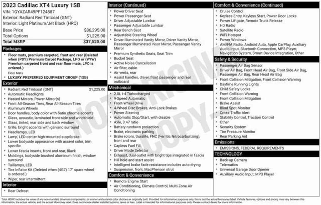 INCLUDES WARRANTY, 7-Speaker Audio System w/Auxiliary Amplifier, Preferred Equipment Group 1SB, 2-Way Driver Seat Power Lumbar Control, 2-Way Passenger Seat Power Lumbar Control, 3.47 Axle Ratio, 4-Wheel Disc Brakes, 6-Way Power Passenger Seat Adjuster, 7 Speakers, 8-Way Power Driver Seat Adjuster, ABS brakes, Air Conditioning, Alloy wheels, AM/FM radio: SiriusXM with 360L, Apple CarPlay/Android Auto, Automatic temperature control, Brake assist, Bumpers: body-color, Compass, Delay-off headlights, Driver door bin, Driver vanity mirror, Dual front impact airbags, Dual front side impact airbags, Electronic Stability Control, Emergency communication system: OnStar and Cadillac connected services capable, Four wheel independent suspension, Front anti-roll bar, Front Bucket Seats, Front Center Armrest, Front dual zone A/C, Front reading lights, Fully automatic headlights, Garage door transmitter, HD Radio, Heated door mirrors, Illuminated entry, Inteluxe Seat Trim, Knee airbag, Leather steering wheel, Low tire pressure warning, Occupant sensing airbag, Outside temperature display, Overhead airbag, Overhead console, Panic alarm, Passenger door bin, Passenger vanity mirror, Power door mirrors, Power driver seat, Power Liftgate, Power passenger seat, Power steering, Power windows, Radio data system, Radio: Cadillac User Experience AM/FM Stereo, Rear anti-roll bar, Rear reading lights, Rear seat center armrest, Rear window defroster, Rear window wiper, Remote keyless entry, Security system, SiriusXM w/360L, Speed control, Speed-sensing steering, Split folding rear seat, Spoiler, Standard Suspension, Steering wheel mounted audio controls, Tachometer, Telescoping steering wheel, Tilt steering wheel, Traction control, Trip computer, Variably intermittent wipers, Voltmeter, Wheels: 18 10-Spoke Bright Silver Finish Alloy, Wireless Apple CarPlay/Wireless Android Auto, 7-Speaker Audio System w/Auxiliary Amplifier, Preferred Equipment Group 1SB.