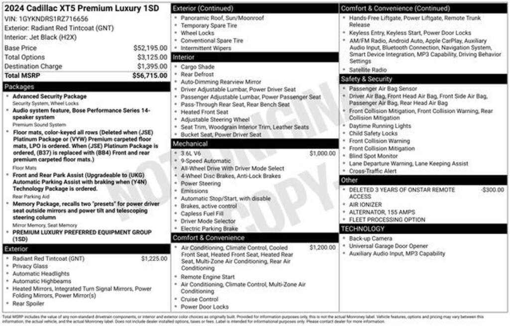INCLUDES WARRANTY, Automatic Dual-Zone Climate Control, Automatic Emergency Braking, Bose Performance Series 14-Speaker System, Dual Driver Info Center Display Gauge Cluster, Front & Rear Park Assist, HD Rear Vision Camera, Inside Rear-View Auto-Dimming Mirror, Navigation System, Premium Luxury Package 1SD, Radio: Cadillac User Experience w/Embedded Nav, SiriusXM w/360L, Teen Driver, Wireless Apple CarPlay/Wireless Android Auto, Wireless Phone Charging, 14 Speakers, 155 Amp Alternator, 2-Way Power Driver Lumbar Control Seat Adjuster, 2-Way Power Passenger Lumbar Control Seat Adjuster, 4-Wheel Disc Brakes, 4-Wheel Independent Suspension, ABS brakes, Air Conditioning, Air Ionizer, Alloy wheels, AM/FM radio: SiriusXM, Audio memory, Auto High-beam Headlights, Auto-dimming door mirrors, Auto-dimming Rear-View mirror, Automatic Stop/Start w/Disable, Automatic temperature control, Bodyside moldings, Brake assist, Bumpers: body-color, Compass, Delay-off headlights, Driver door bin, Driver vanity mirror, Dual front impact airbags, Dual front side impact airbags, Electronic Stability Control, Emergency communication system: OnStar and Cadillac connected services capable, Four wheel independent suspension, Front anti-roll bar, Front Bucket Seats, Front Center Armrest, Front dual zone A/C, Front reading lights, Fully automatic headlights, Garage door transmitter, Genuine wood dashboard insert, Genuine wood door panel insert, Heated door mirrors, Heated Driver & Front Passenger Seats, Heated front seats, Heated Rear Outboard Seating Positions, Heated steering wheel, Illuminated entry, Knee airbag, Leather Seating Surfaces w/Mini Perforated Inserts, Low tire pressure warning, Memory seat, Occupant sensing airbag, Outside temperature display, Overhead airbag, Overhead console, Panic alarm, Passenger door bin, Passenger vanity mirror, Power door mirrors, Power driver seat, Power Liftgate, Power moonroof: UltraView, Power passenger seat, Power steering, Power windows, Radio data system, Rain sensing wipers, Rear anti-roll bar, Rear reading lights, Rear seat center armrest, Rear window defroster, Rear window wiper, Remote keyless entry, Security system, Speed control, Speed-sensing steering, Split folding rear seat, Spoiler, Steering wheel memory, Steering wheel mounted audio controls, Tachometer, Telescoping steering wheel, Tilt steering wheel, Traction control, Tri-Zone Automatic Climate Control, Trip computer, Turn signal indicator mirrors, Variably intermittent wipers, Ventilated Driver & Front Passenger Seats, Voltmeter, Wheels: 20 6-Split Spoke Alloy, Automatic Dual-Zone Climate Control, Automatic Emergency Braking, Bose Performance Series 14-Speaker System, Dual Driver Info Center Display Gauge Cluster, Front & Rear Park Assist, HD Rear Vision Camera, Inside Rear-View Auto-Dimming Mirror, Navigation System, Premium Luxury Package 1SD, Radio: Cadillac User Experience w/Embedded Nav, SiriusXM w/360L, Teen Driver, Wireless Apple CarPlay/Wireless Android Auto, Wireless Phone Charging.