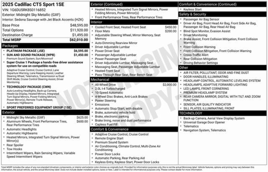 Midnight Sky Metallic 2025 Cadillac CT5 SportINCLUDES WARRANTY, Adaptive Forward Lighting Headlamps, Air Quality Indicator Sensor, Automatic Leveling System Headlamp Control, Body-Color Heated Power-Adjustable Outside Mirrors, Digital Rear Camera Mirror w/Tilt & Zoom Function, Front Cornering LED Lamps, Hands-Free Decklid Release, Head-Up Display, Illuminating Door Handles, Illuminating Front Sill Plates, LED Reflective Windshield Collision Alert, Navigation System, Platinum Package, Pollutant/Odor/Fine Dust Air Filter, Preferred Equipment Group 1SE, Premium Headlamp System, Semi-Aniline Leather Seating Surfaces, Sun & Sound Package, Technology Package, UltraView Dual Pane Sunroof, 15 Speakers, 4-Wheel Disc Brakes, 8-Way Power Driver Seat Adjuster, 8-Way Power Front Passenger Seat Adjuster, ABS brakes, Air Conditioning, AKG 15-Speaker System, All-Weather Floor Mats, Alloy wheels, AM/FM radio: SiriusXM with 360L, Apple CarPlay/Android Auto, Auto High-beam Headlights, Auto-dimming door mirrors, Auto-dimming Rear-View mirror, Automatic Stop/Start w/Disable, Automatic temperature control, Brake assist, Bumpers: body-color, Compass, Delay-off headlights, Driver 4-Way Power Lumbar Seat Adjuster, Driver door bin, Driver Manual Cushion Length Adjustment Seat, Driver Power Lumbar Massage Seat, Driver Power Seatback Bolster Adjustment, Driver vanity mirror, Dual front impact airbags, Dual front side impact airbags, Electronic Stability Control, Emergency communication system: OnStar and Cadillac connected services capable, Exterior Parking Camera Rear, Four wheel independent suspension, Front anti-roll bar, Front Bucket Seats, Front Center Armrest, Front dual zone A/C, Front Passenger 4-Way Power Lumbar Seat Adjuster, Front Passenger Manual Cushion Length Adjustment, Front Passenger Power Lumbar Massage Seat, Front Passenger Power Seatback Bolster Adjustment, Front reading lights, Fully automatic headlights, Garage door transmitter, Heated door mirrors, Heated Driver & Front Passenger Seats, Heated front seats, Heated steering wheel, Illuminated entry, Inteluxe Seating Surfaces, Knee airbag, Leather steering wheel, Low tire pressure warning, Memory seat, Occupant sensing airbag, Outside temperature display, Overhead airbag, Overhead console, Panic alarm, Passenger door bin, Passenger vanity mirror, Power door mirrors, Power driver seat, Power passenger seat, Power steering, Power windows, Radio data system, Radio: Google Built-In Infotainment Experience, Rain sensing wipers, Rear anti-roll bar, Rear reading lights, Rear seat center armrest, Rear window defroster, Remote keyless entry, SiriusXM w/360L Trial Subscription, Speed control, Speed-sensing steering, Split folding rear seat, Spoiler, Steering wheel memory, Steering wheel mounted audio controls, Tachometer, Telescoping steering wheel, Tilt steering wheel, Traction control, Trip computer, Turn signal indicator mirrors, UltraView Dual Pane Sunroof (DISC), Variably intermittent wipers, Ventilated Driver & Front Passenger Seats, Voltmeter, Wheels: 19 Alloy w/Pearl Nickel Finish, Wheels: 19 Alloy w/Satin Graphite Finish, Adaptive Forward Lighting Headlamps, Air Quality Indicator Sensor, Automatic Leveling System Headlamp Control, Body-Color Heated Power-Adjustable Outside Mirrors, Digital Rear Camera Mirror w/Tilt & Zoom Function, Front Cornering LED Lamps, Hands-Free Decklid Release, Head-Up Display, Illuminating Door Handles, Illuminating Front Sill Plates, LED Reflective Windshield Collision Alert, Navigation System, Platinum Package, Pollutant/Odor/Fine Dust Air Filter, Preferred Equipment Group 1SE, Premium Headlamp System, Semi-Aniline Leather Seating Surfaces, Sun & Sound Package, Technology Package, UltraView Dual Pane Sunroof.Clean CARFAX.Why Choose Cadillac of Fayetteville for Your Next New or Pre-Owned Cadillac Purchase:Unparalleled Cadillac Luxury: Whether new or pre-owned, our Cadillac vehicles offer unmatched luxury and sophistication, elevating you