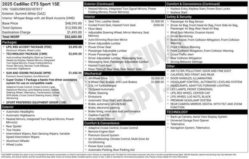 Summit White 2025 Cadillac CT5 SportINCLUDES WARRANTY, Adaptive Forward Lighting Headlamps, Air Quality Indicator Sensor, Automatic Leveling System Headlamp Control, Black Wheel Locks (LPO), Black Wheel Lug Nuts (LPO), Body-Color Heated Power-Adjustable Outside Mirrors, Decals (LPO), Digital Rear Camera Mirror w/Tilt & Zoom Function, Front Cornering LED Lamps, Hands-Free Decklid Release, Head-Up Display, Illuminating Door Handles, Illuminating Front Sill Plates, LED Reflective Windshield Collision Alert, Navigation System, Pollutant/Odor/Fine Dust Air Filter, Preferred Equipment Group 1SE, Premium Headlamp System, Red Accent Package (LPO), Red Wheel Center Cap (LPO), Sun & Sound Package, Technology Package, UltraView Dual Pane Sunroof, Wheels: 20 Low Gloss Blk Alloy w/Red Accents (LPO), Wheels: 20 Transit Steel, 15 Speakers, 4-Wheel Disc Brakes, 8-Way Power Driver Seat Adjuster, 8-Way Power Front Passenger Seat Adjuster, ABS brakes, Air Conditioning, AKG 15-Speaker System, Alloy wheels, AM/FM radio: SiriusXM with 360L, Apple CarPlay/Android Auto, Auto High-beam Headlights, Auto-dimming door mirrors, Auto-dimming Rear-View mirror, Automatic Stop/Start w/Disable, Automatic temperature control, Brake assist, Brembo V Performance Front Brakes (Blue), Bumpers: body-color, Compass, Delay-off headlights, Driver 4-Way Power Lumbar Seat Adjuster, Driver door bin, Driver Manual Cushion Length Adjustment Seat, Driver Power Lumbar Massage Seat, Driver Power Seatback Bolster Adjustment, Driver vanity mirror, Dual front impact airbags, Dual front side impact airbags, Electronic Stability Control, Emergency communication system: OnStar and Cadillac connected services capable, Exterior Parking Camera Rear, Four wheel independent suspension, Front & Rear Blue Calipers, Front & Rear Red Calipers, Front anti-roll bar, Front Bucket Seats, Front Center Armrest, Front dual zone A/C, Front Passenger 4-Way Power Lumbar Seat Adjuster, Front Passenger Manual Cushion Length Adjustment, Front Passenger Power Lumbar Massage Seat, Front Passenger Power Seatback Bolster Adjustment, Front reading lights, Fully automatic headlights, Garage door transmitter, Heated door mirrors, Heated Driver & Front Passenger Seats, Heated front seats, Heated steering wheel, Illuminated entry, Inteluxe Seating Surfaces, Knee airbag, Leather steering wheel, Low tire pressure warning, Memory seat, Occupant sensing airbag, Outside temperature display, Overhead airbag, Overhead console, Panic alarm, Passenger door bin, Passenger vanity mirror, Power door mirrors, Power driver seat, Power passenger seat, Power steering, Power windows, Radio data system, Radio: Google Built-In Infotainment Experience, Rain sensing wipers, Rear anti-roll bar, Rear reading lights, Rear seat center armrest, Rear window defroster, Remote keyless entry, SiriusXM w/360L Trial Subscription, Speed control, Speed-sensing steering, Split folding rear seat, Spoiler, Steering wheel memory, Steering wheel mounted audio controls, Tachometer, Telescoping steering wheel, Tilt steering wheel, Traction control, Trip computer, Turn signal indicator mirrors, UltraView Dual Pane Sunroof (DISC), Variably intermittent wipers, Ventilated Driver & Front Passenger Seats, Voltmeter, Wheels: 19 Alloy w/Pearl Nickel Finish, Adaptive Forward Lighting Headlamps, Air Quality Indicator Sensor, Automatic Leveling System Headlamp Control, Black Wheel Locks (LPO), Black Wheel Lug Nuts (LPO), Body-Color Heated Power-Adjustable Outside Mirrors, Decals (LPO), Digital Rear Camera Mirror w/Tilt & Zoom Function, Front Cornering LED Lamps, Hands-Free Decklid Release, Head-Up Display, Illuminating Door Handles, Illuminating Front Sill Plates, LED Reflective Windshield Collision Alert, Navigation System, Pollutant/Odor/Fine Dust Air Filter, Preferred Equipment Group 1SE, Premium Headlamp System, Red Accent Package (LPO), Red Wheel Center Cap (LPO), Sun & Sound Package, Technology Package, UltraView Dual Pane Sunroof, Wheels: 20 Lo
