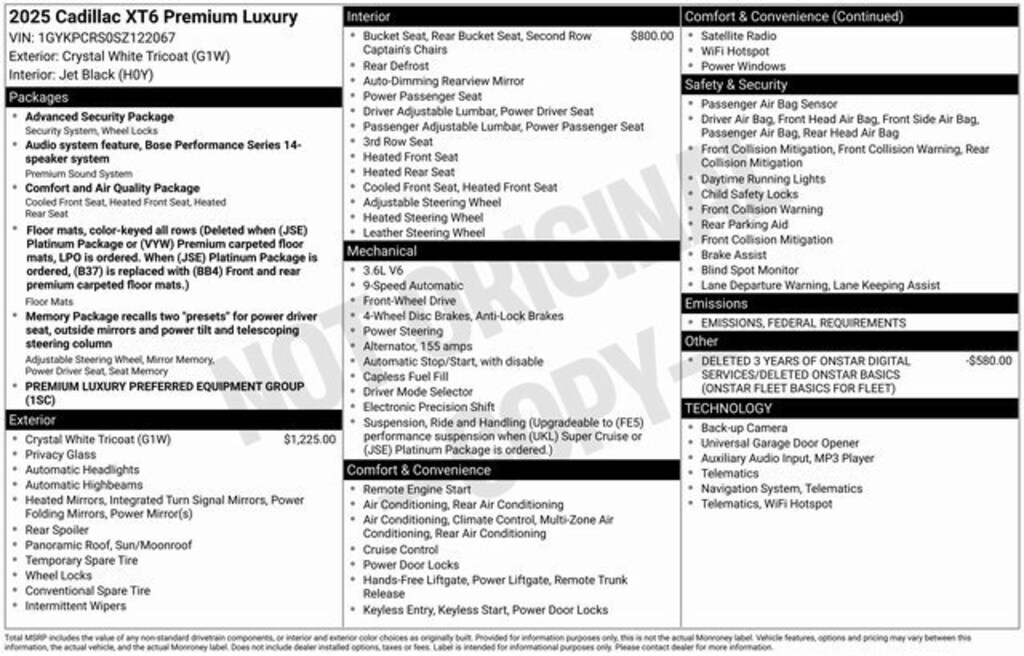 INCLUDES WARRANTY, Automatic Emergency Braking, Bose Performance Series Audio System, Dual Driver Info Center Display Gauge Cluster, Front & Rear Park Assist, Inside Rear-View Auto-Dimming Mirror, Navigation System, Preferred Equipment Group 1SC, Radio: Cadillac User Experience w/Embedded Nav, SiriusXM w/360L, Teen Driver, Wireless Apple CarPlay/Wireless Android Auto, 14 Speakers, 2-Way Power Driver Lumbar Control Seat Adjuster, 2-Way Power Passenger Lumbar Control Seat Adjuster, 3rd row seats: split-bench, 4-Wheel Disc Brakes, 6-Passenger Seating, 8-Way Power Driver Seat Adjuster, ABS brakes, Air Conditioning, Alloy wheels, AM/FM radio: SiriusXM with 360L, Audio memory, Auto High-beam Headlights, Auto tilt-away steering wheel, Auto-dimming door mirrors, Auto-dimming Rear-View mirror, Automatic Stop/Start w/Disable, Automatic temperature control, Brake assist, Bumpers: body-color, Compass, Delay-off headlights, Deleted 3 Years of OnStar Digital Services, Driver & Front Passenger Heated Seats, Driver door bin, Driver vanity mirror, Dual front impact airbags, Dual front side impact airbags, Electronic Stability Control, Emergency communication system: OnStar and Cadillac connected services capable, Four wheel independent suspension, Front anti-roll bar, Front Bucket Seats, Front Center Armrest, Front dual zone A/C, Front reading lights, Fully automatic headlights, Garage door transmitter, Genuine wood dashboard insert, Genuine wood door panel insert, Heated door mirrors, Heated front seats, Heated rear seats, Heated steering wheel, Illuminated entry, Knee airbag, Leather Seating Surfaces w/Mini-Perforated Inserts, Leather steering wheel, Low tire pressure warning, Memory seat, Occupant sensing airbag, Outside temperature display, Overhead airbag, Overhead console, Panic alarm, Passenger door bin, Passenger vanity mirror, Power door mirrors, Power driver seat, Power Liftgate, Power moonroof: UltraView, Power passenger seat, Power steering, Power windows, Radio data system, Rain sensing wipers, Rear air conditioning, Rear anti-roll bar, Rear reading lights, Rear seat center armrest, Rear window defroster, Rear window wiper, Remote keyless entry, Ride & Handling Suspension, Security system, Speed control, Speed-sensing steering, Split folding rear seat, Spoiler, Steering wheel memory, Steering wheel mounted audio controls, Tachometer, Telescoping steering wheel, Tilt steering wheel, Traction control, Trip computer, Turn signal indicator mirrors, Variably intermittent wipers, Ventilated Driver & Front Passenger Seats, Ventilated front seats, Voltmeter, Wheels: 20 6-Split Spoke Alloy, Automatic Emergency Braking, Bose Performance Series Audio System, Dual Driver Info Center Display Gauge Cluster, Front & Rear Park Assist, Inside Rear-View Auto-Dimming Mirror, Navigation System, Preferred Equipment Group 1SC, Radio: Cadillac User Experience w/Embedded Nav, SiriusXM w/360L, Teen Driver, Wireless Apple CarPlay/Wireless Android Auto.