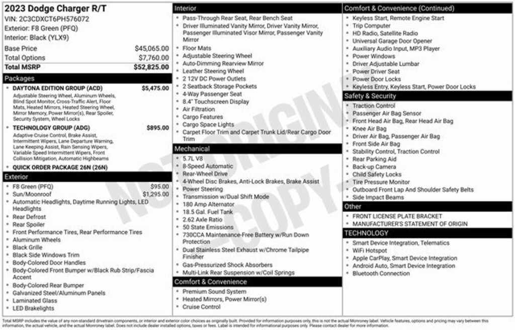 INCLUDES WARRANTY, Black Artificial Leather, Adaptive Cruise Control w/Stop, Advanced Brake Assist, Auto Adjust In Reverse Exterior Mirrors, Auto High Beam Headlamp Control, Auto-Dimming Exterior Driver Mirror, Black 1-Piece Performance Spoiler, Black-Edged Premium Floormats, Blind Spot & Cross Path Detection, Blind Spot Memory/Power/Heat Mirror, Carbonite Interior Accents, Daytona Decals Hood/Roof/Trunk, Daytona Edition Group, Daytona Front Grille Badge, Daytona I/P Badge, Daytona Logo Nappa/Alcantara Seat, Deluxe Security Alarm, Driver & Passenger Lower LED Lamps, Exterior Mirrors Courtesy Lamps, Exterior Mirrors w/Heating Element, Front & Rear LED Map Pockets, Front Overhead LED Lighting, Full Speed FWD Collision Warn Plus, Gloss Black I/P Cluster Trim Rings, Heated Front Seats, Heated Steering Wheel, Lane Departure Warning Plus, MOPAR Cold Air Intake System, Power 2-Way Driver Lumbar Adjust, Power 2-Way Passenger Lumbar Adjust, Power Front Driver/Passenger Seats, Power Tilt/Telescope Steering Column, Premium-Stitched Dash Panel, Quick Order Package 26N, Radio/Driver Seat/Mirrors Memory, Rain Sensitive Windshield Wipers, Rear Armrest w/Cupholder Seat, Rhombi 2-Pc Wheel Center Cap, Satin Black Charger Decklid Badge, Technology Group, Ventilated Front Seats, Wheels: 20 x 9 Lo Gloss Granite Crystal, 1-Yr SiriusXM Guardian Trial, 2-Piece Shark Fin Antenna, 4-Wheel Disc Brakes, 4G LTE Wi-Fi Hot Spot, 6 Speakers, 8.4 Touchscreen Display, ABS brakes, Air Conditioning, Alloy wheels, AM/FM radio: SiriusXM, Anti-whiplash front head restraints, Apple CarPlay, Apple CarPlay/Android Auto, Auto-dimming Rear-View mirror, Automatic temperature control, Brake assist, Bumpers: body-color, Cloth Performance Seats, Compass, Delay-off headlights, Driver door bin, Driver vanity mirror, Dual front impact airbags, Dual front side impact airbags, Electronic Stability Control, Emergency communication system: SiriusXM Guardian, For Details, Visit DriveUconnect.com, Four wheel independent suspension, Front anti-roll bar, Front Bucket Seats, Front Center Armrest, Front dual zone A/C, Front License Plate Bracket, Front reading lights, Fully automatic headlights, Garage door transmitter: HomeLink, Google Android Auto, GPS Antenna Input, HD Radio, Heated door mirrors, Illuminated entry, Integrated Center Stack Radio, Integrated Voice Command w/Bluetooth, Knee airbag, Leather Shift Knob, Low tire pressure warning, Manufacturer's Statement of Origin, Media Hub (2 USB, AUX), Occupant sensing airbag, Outside temperature display, Overhead airbag, Overhead console, Panic alarm, ParkView Rear Back-Up Camera, Passenger door bin, Passenger vanity mirror, Power 8-Way Driver Seat, Power door mirrors, Power driver seat, Power steering, Power Sunroof, Power windows, Radio: Uconnect 4C w/8.4 Display, Rear anti-roll bar, Rear reading lights, Rear seat center armrest, Rear window defroster, Remote keyless entry, Speed control, Speed-Sensitive Wipers, Split folding rear seat, Spoiler, Sport steering wheel, Steering wheel mounted audio controls, Tachometer, Telescoping steering wheel, Tilt steering wheel, Traction control, Trip computer, USB Host Flip, Variably intermittent wipers, Wheels: 20 x 8 Machined w/Granite Pocket, Black Artificial Leather, Adaptive Cruise Control w/Stop, Advanced Brake Assist, Auto Adjust In Reverse Exterior Mirrors, Auto High Beam Headlamp Control, Auto-Dimming Exterior Driver Mirror, Black 1-Piece Performance Spoiler, Black-Edged Premium Floormats, Blind Spot & Cross Path Detection, Blind Spot Memory/Power/Heat Mirror, Carbonite Interior Accents, Daytona Decals Hood/Roof/Trunk, Daytona Edition Group, Daytona Front Grille Badge, Daytona I/P Badge, Daytona Logo Nappa/Alcantara Seat, Deluxe Security Alarm, Driver & Passenger Lower LED Lamps, Exterior Mirrors Courtesy Lamps, Exterior Mirrors w/Heating Element, Front & Rear LED Map Pockets, Front Overhead LED Lig