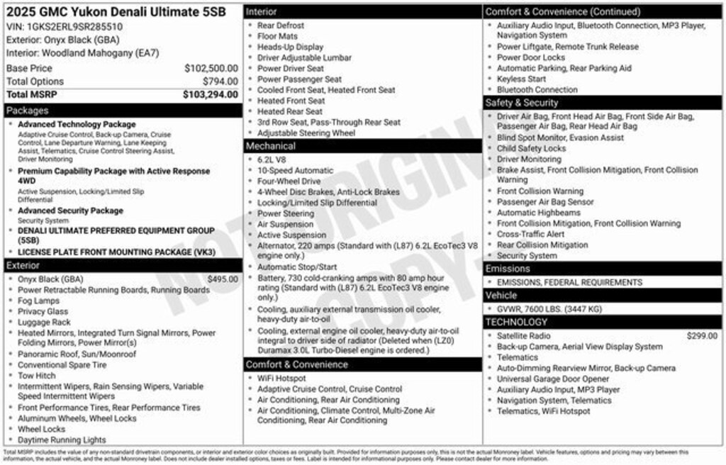 INCLUDES WARRANTY, 4WD, 15 Diagonal Multi-Color Head-Up Display, 3 Years of OnStar Digital Services/Safety Services, 4-Spoke Leather-Wrapped Steering Wheel, 4-Way Power Driver Lumbar Seat Adjuster, 4-Way Power Front Passenger Lumbar Seat Adjuster, 8 Diagonal Rear Touchscreen Climate Control, Advanced Security Package, Advanced Technology Package, Air Ride Adaptive Suspension, AutoSense Hands-Free Power Liftgate, Blind Zone Steering Assist w/Trailering, Bose 18-Speaker Surround w/CenterPoint, Bright Front & Rear Door Sill Plates, Driver 2-Way Power Upper Shoulder, Driver Attention Assist, Driver Power Massage Seat, Dual Exhaust System, Dual-Pane Panoramic Power Sunroof, Electronic Limited Slip Differential (eLSD), Extra Capacity Cooling System, Front Passenger 2-Way Power Upper Shoulder, Front Passenger Power Massage Seat, Glass Breakage Sensor, Hill Descent Control, Hitch View, Inside Rearview Auto-Dimming Rear Camera Mirror, Integrated Trailer Brake Controller, License Plate Front Mounting Package, Max Trailering Package, Navigation system: GMC Connected Navigation, Perforated Heated & Ventilated Dr & Frt Pass Seats, Power Release 2nd Row Bucket Seats, Power Tilt & Telescopic Steering Column, Power-Retractable Assist Steps, Preferred Equipment Group 5SB, Premium Capability Package w/Active Response 4WD, Rear Seat Media System, Smart Trailer Integration Indicator, Sport Pedal Cover Kit (LPO), Super Cruise, Theft-Deterrent Alarm System, Vader Bodyside Moldings, Vehicle Inclination Sensor, Vehicle Interior Movement Sensor, 18 Speakers, 3 Years SiriusXM, 3.23 Rear Axle Ratio, 3rd row seats: split-bench, 4-Wheel Disc Brakes, ABS brakes, Adaptive suspension, Air Conditioning, Alloy wheels, AM/FM radio: SiriusXM with 360L, Apple CarPlay/Android Auto, Audio memory, Auto High-beam Headlights, Auto-dimming door mirrors, Auto-dimming Rear-View mirror, Auto-leveling suspension, Automatic temperature control, Bodyside moldings, Brake assist, Bumpers: body-color, Compass, Delay-off headlights, Driver door bin, Driver vanity mirror, Dual front impact airbags, Dual front side impact airbags, Electronic Stability Control, Emergency communication system: OnStar and GMC connected services capable, Exterior Parking Camera Rear, Four wheel independent suspension, Front anti-roll bar, Front Bucket Seats, Front Center Armrest, Front dual zone A/C, Front fog lights, Front reading lights, Full Grain Leather Seats, Fully automatic headlights, Garage door transmitter, Headphones, Heads-Up Display, Heated door mirrors, Heated Driver & Front Passenger Seats, Heated front seats, Heated rear seats, Heated steering wheel, Illuminated entry, Leather steering wheel, Low tire pressure warning, Magnetic Ride Control Suspension, Memory seat, Occupant sensing airbag, Outside temperature display, Overhead airbag, Overhead console, Panic alarm, Passenger door bin, Passenger vanity mirror, Power door mirrors, Power driver seat, Power Liftgate, Power moonroof, Power passenger seat, Power steering, Power windows, Radio: 16.8 Diagonal Premium GMC Infotainment Sys, Rain sensing wipers, Rear air conditioning, Rear anti-roll bar, Rear audio controls, Rear reading lights, Rear window defroster, Rear window wiper, Remote keyless entry, Security system, SiriusXM w/360L, Speed control, Speed-sensing steering, Split folding rear seat, Spoiler, Steering wheel memory, Steering wheel mounted audio controls, Tachometer, Telescoping steering wheel, Tilt steering wheel, Traction control, Trip computer, Turn signal indicator mirrors, Variably intermittent wipers, Ventilated front seats, Voltmeter, Wheel Locks (Set of 4) (LPO), Wheels: 24 x 9.5 Selective Machined & Painted, 4WD, 15 Diagonal Multi-Color Head-Up Display, 3 Years of OnStar Digital Services/Safety Services, 4-Spoke Leather-Wrapped Steering Wheel, 4-Way Power Driver Lumbar Seat Adjuster, 4-Way Power Front Passenger Lumbar Sea