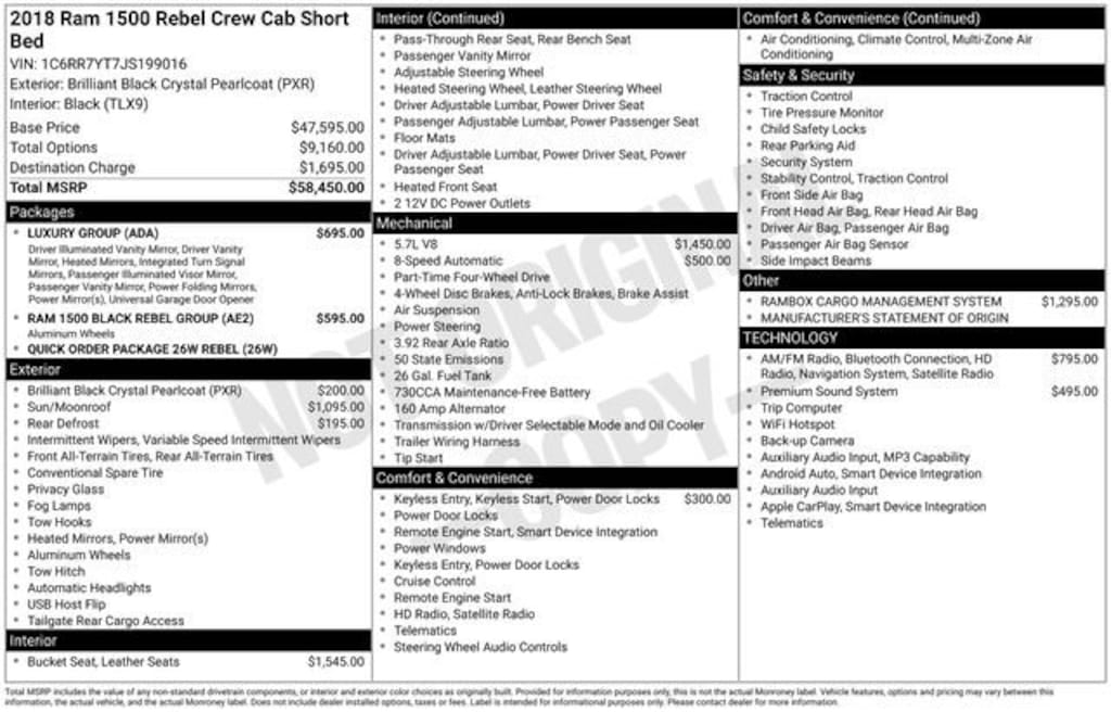 The 2018 Ram 1500 Rebel is more than just a capable workhorse; it's a true luxury-minded off-road machine. The Luxury Group package elevates the experience with features like auto-dimming exterior mirrors, power-folding mirrors, and an overhead console with a universal garage door opener. The RamBox Cargo Management System provides secure, versatile storage solutions, while the 9-speaker Alpine audio system with subwoofer ensures your music sounds as powerful as the truck itself.